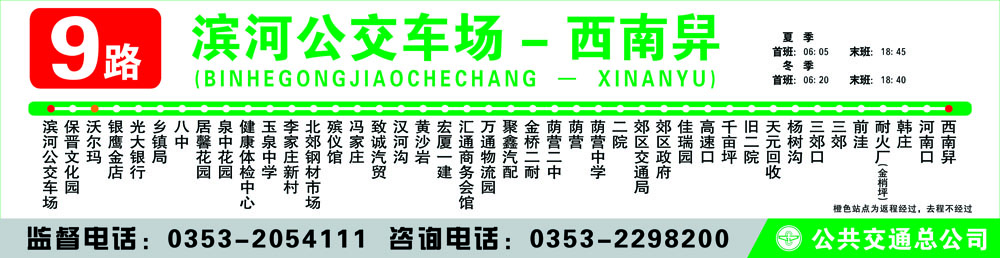 濱河公交車場(chǎng) - 保晉文化園 - 銀鷹金店 – 光大銀行 - 鄉(xiāng)鎮(zhèn)局 - 八中 - 居馨花園 – 泉 中花園 - 健康體檢中心 - 玉泉中學(xué) - 李家莊新村 - 北郊鋼材市場(chǎng) – 殯儀館 - 馮家莊 – 致誠(chéng)汽貿(mào) - 漢河溝 - 黃沙巖 - 匯通商務(wù)會(huì)館 - 萬(wàn)通物流園 - 聚鑫汽配 - 金橋二耐 - 蔭營(yíng)二中 - 蔭營(yíng) - 蔭營(yíng)中學(xué) - 二院 - 郊區(qū)交通運(yùn)輸局 - 郊區(qū)政府 - 佳瑞園 - 高速口 - 千畝坪 - 舊二院 - 天元回 收 - 楊樹溝 - 三郊口 - 新世紀(jì) - 三郊 - 前洼 - 耐火廠(金梢坪)- 韓莊 - 河南口 - 西南 舁 - 五里莊 - 雨下溝
